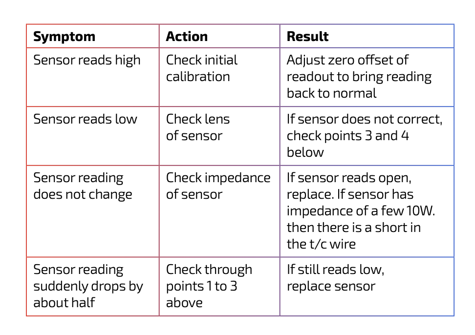There are only three possible failure modes for an IRt/c sensor. If an IRt/c sensor is installed and does not function as expected, the failure may be due to something other than the sensor. It is recommended that the sensor is checked for response after installation, to ensure that it is properly connected to the readout instrument. This can be done simply by placing a hand or a heat source in front of the sensor after it is installed and making sure the reading changes. This is still valid even if the temperature is well below the calibration point. If the sensor gives a reading very different from the expected reading, try the following troubleshooting steps: